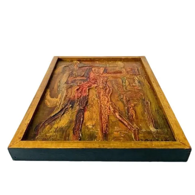 Abstract schilderij olieverf op hout gemaakt met impasto techniek, gesigneerd J. Dieltjens 1966. De kleuren van het olieverfschilderij zijn warm, voornamelijk geel, oranje en bruin. Het toont mogelijk gestileerde menselijke figuren.