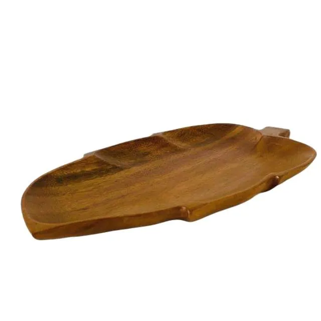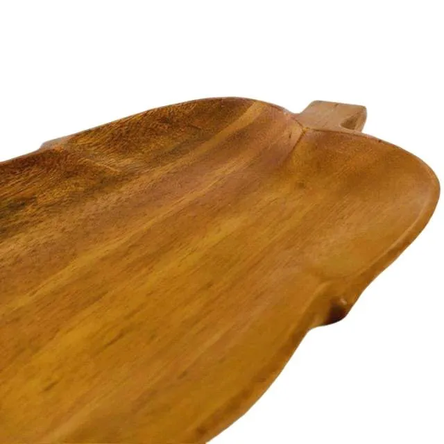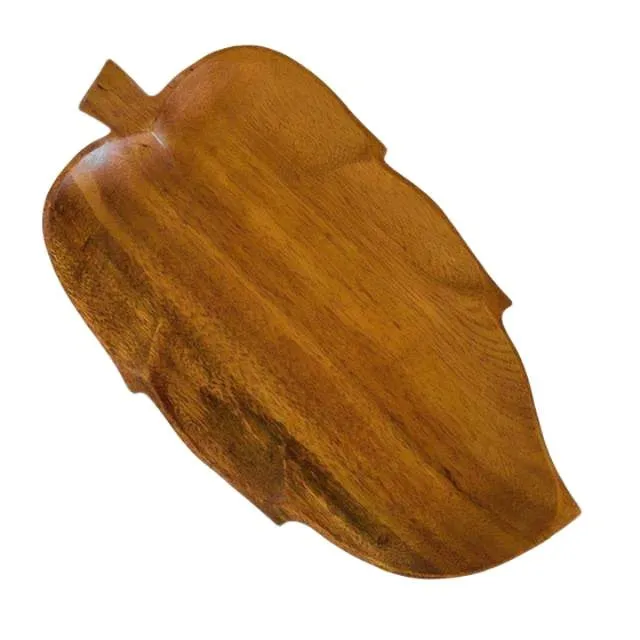 Prachtige acacia houten hapjesschaal in een blad vorm uit de jaren 70. Deze vintage hapjesschaal is gemaakt massief acacia hout, ook wel genoemd monkey wood, en is gelakt. De schaal is dus makkelijk schoon te maken. De schaal is aan de onderzijde gemerkt.