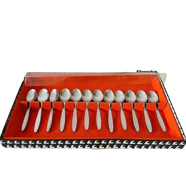 Leuke set van 12 vintage Amefa theelepels gemaakt van RVS in het originele doosje.