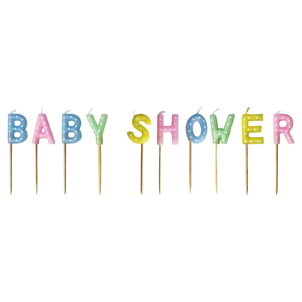 De verpakking bevat 10 kaarsjes in pastelkleur met vrolijke stippen. Elk kaarsje heeft een letter en samen vormen ze de woorden Baby Shower.