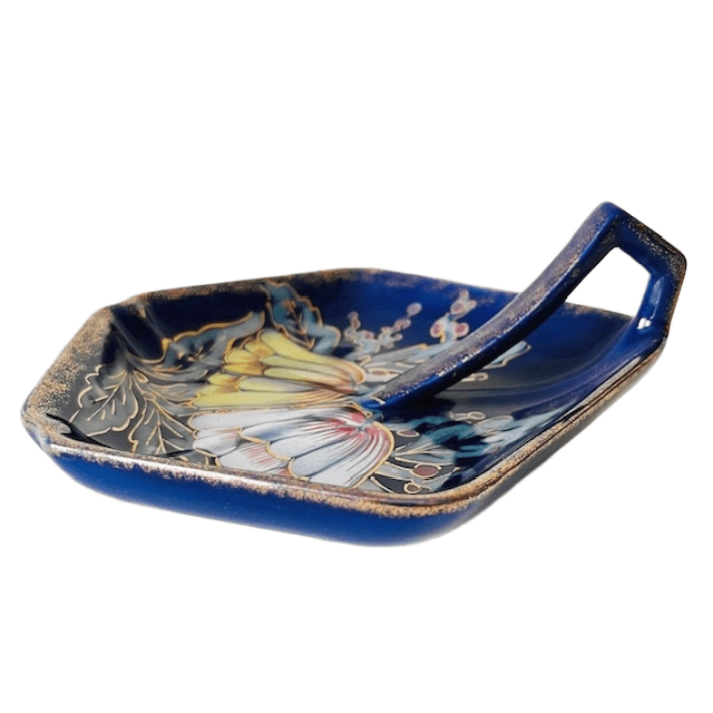 Het notenschaaltje heeft een prachtige blauwe kleur met handgeschilderde gele en witte hangende bloemen en glinsterende gouden details.