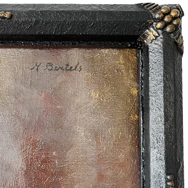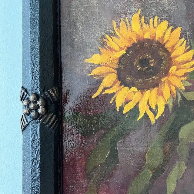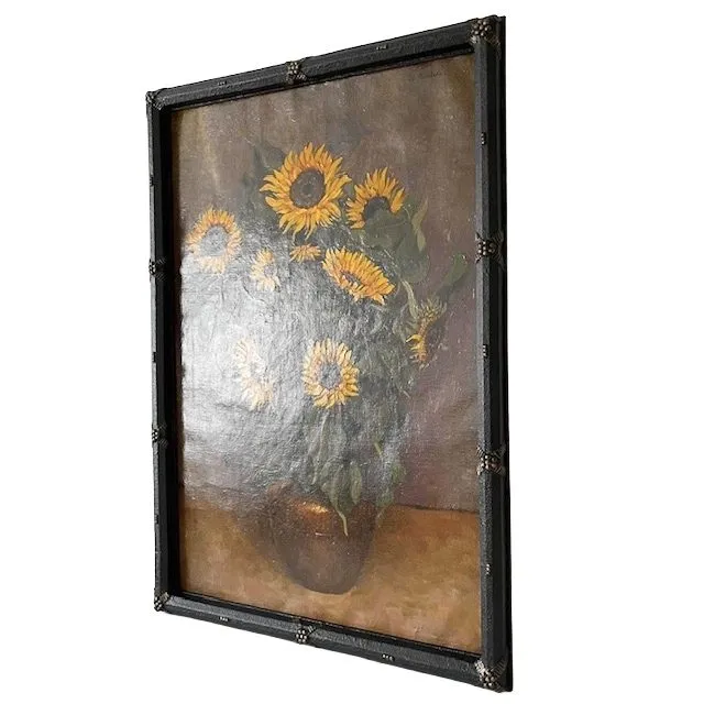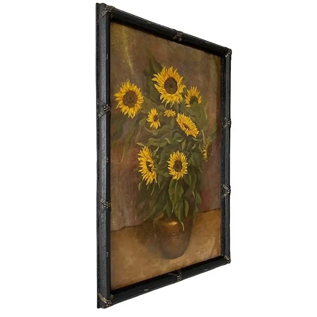 Prachtig antiek XL schilderij met zonnebloemen in olieverf en een barok zwarte lijst met gouden details uit de jaren 20. Het schilderij is geschilderd door Martinus Joseph Bertels (1897) geboren in Gouda. Deze Nederlandse meester was naast kunstschilder was Bertels monumentaal kunstenaar en mozaiëkwerker.