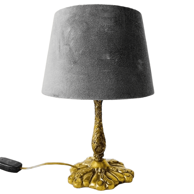 Prachtige Antieke Art nouveau tafellamp bestaande uit messing bladachtige lampenvoet uit circa 1910 en moderne grijze velours lampenkap.