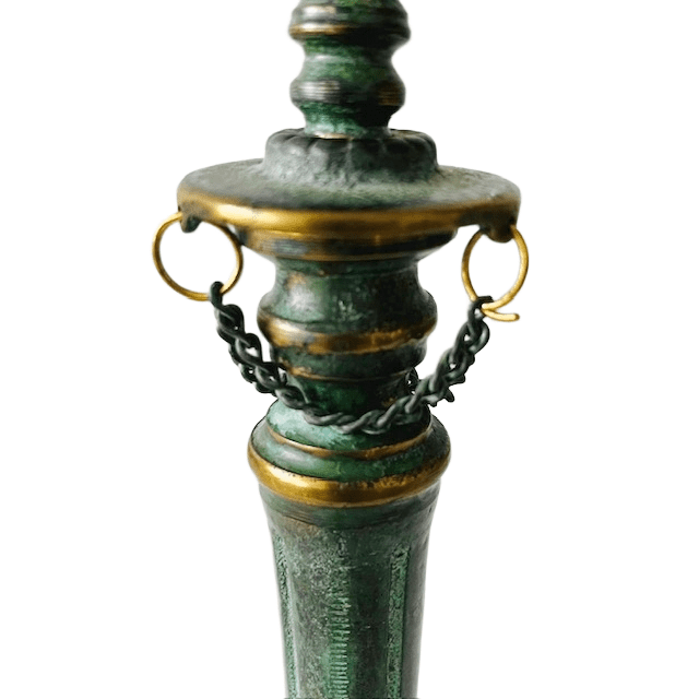 Deze kandelaar van brons heeft een zuilvorm en messing kettingen als decoratie.