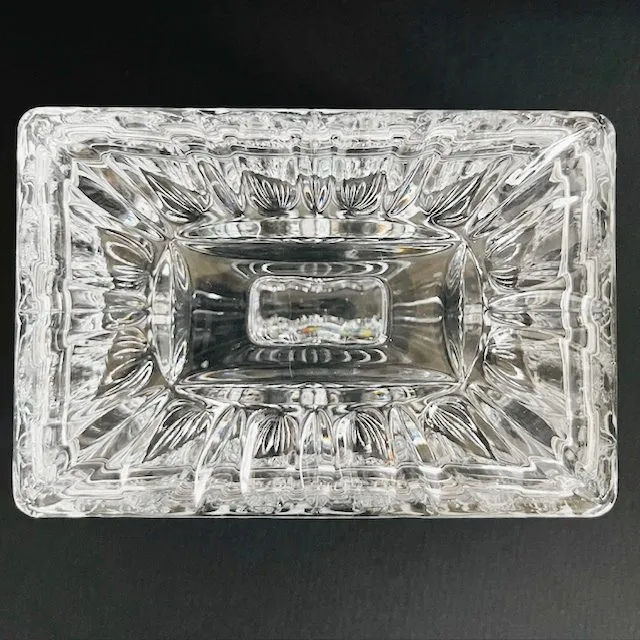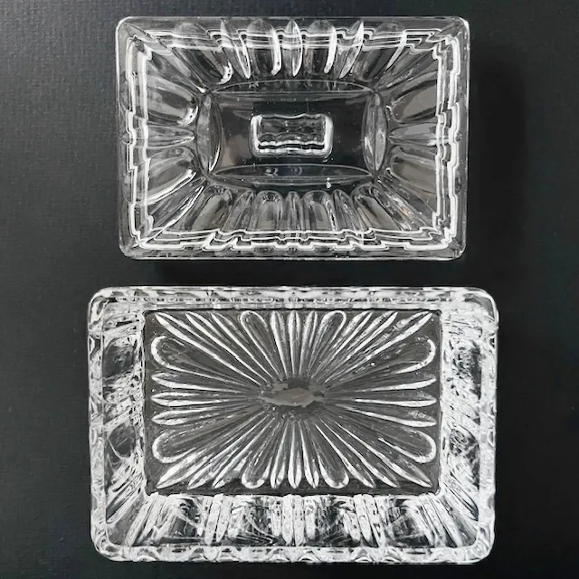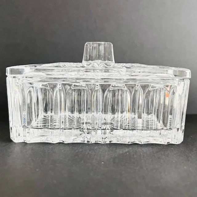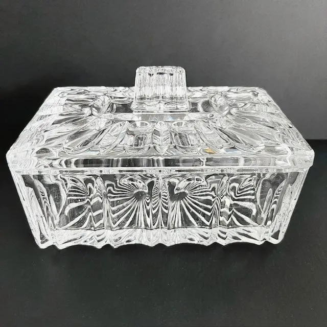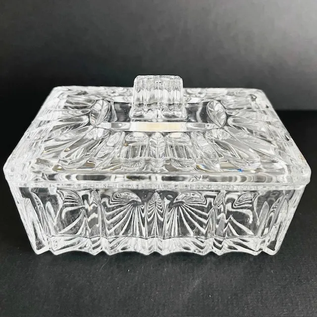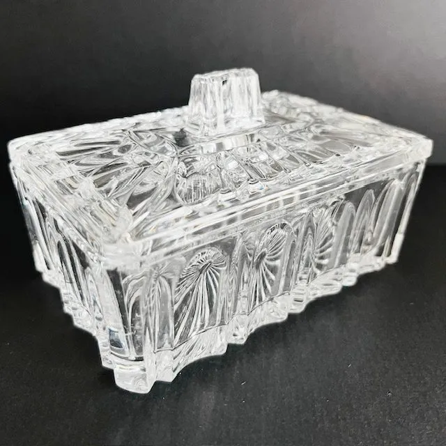 Prachtige Antieke Franse sieradendoos gemaakt van helder geslepen kristal uit circa 1900. Dit doosje is van oorsprong een botervloot of sigarettendoos, maar is ideaal om je sieraden in op te bergen. Deze elegante, doorzichtige kristallen doos is een geweldige aanvulling op je kaptafel, kaptafel of bureau.