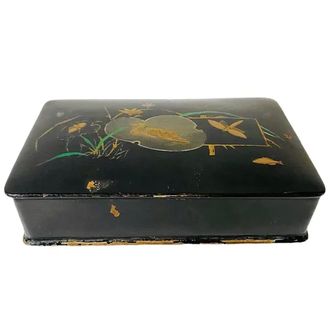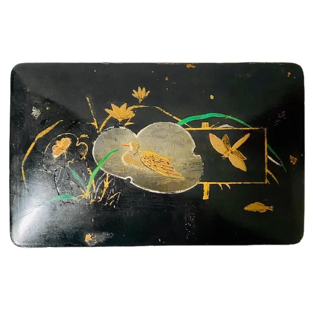 Prachtige antieke Japanse lakdoos met handgeschilderd vijver tafereel met o.a. lelie’s, een eend uit de jaren 20. Leuk om als sieradendoos te gebruiken.