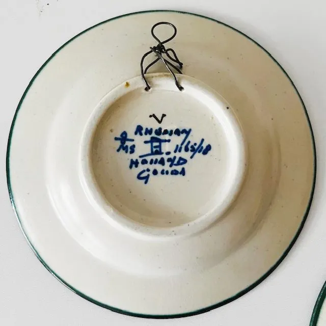 Prachtige antieke set van twee handgeschilderde Rhodian sierbordjes gemaakt door Plateelbakkerij Zuid-Holland in 1924 en keurig voorzien van het jaarmerk.