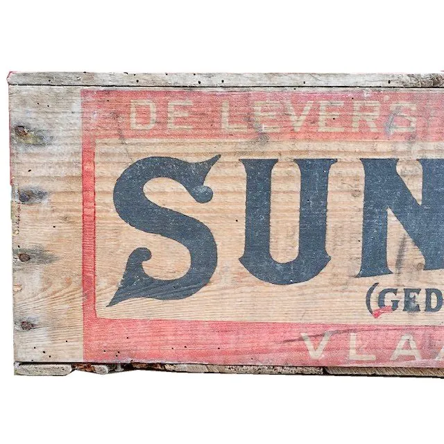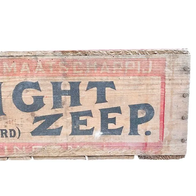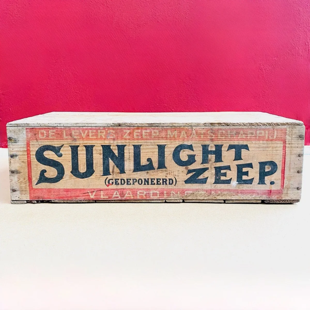 Antieke zeldzame Sunlight zeepkist uit 1920 die gebruikt werd voor het vervoer van Sunlight zeep. Deze zeepkist heeft op de lange zijkanten in mooi rood en zwart de tekst “SUNLIGHT ZEEP (Gedeponeerd) De lever’s Zeep Maatschappij Vlaardingen”. Bijzonder is dat deze houten kist het originele deksel nog heeft.