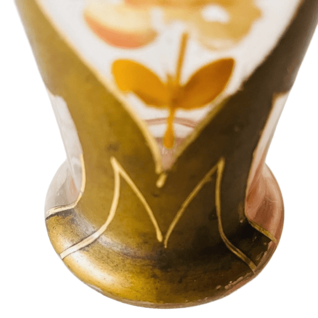 Prachtige antieke Victoriaanse Art nouveau vergulde gouden handbeschilderde glazen vaas. Het glas van deze vaas heeft een lichtroze transparante kleur.