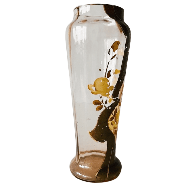 Deze art noveau vaas is in redelijke vintage staat. De beschildering is enigszins gesleten dat het antieke karakter ervan benadrukt. De antiek glazen vaas heeft twee kleine chipjes aan de bovenzijde (zie foto’s). Dit valt nagenoeg niet op wanneer er een boeketje in staat.