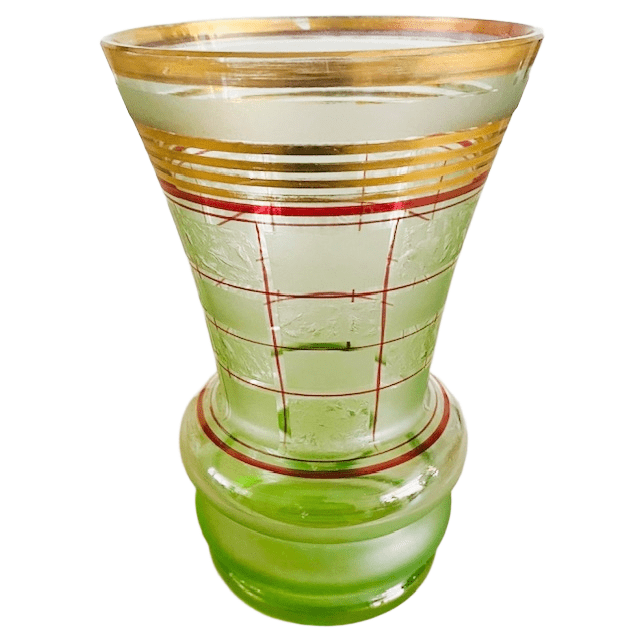 Prachtige Art Deco Booms vaas in groen glas gemaakt door de Rupel met rood en goud lijnen spel uit de jaren 30. De artdeco vaas is in een goede staat en het heeft nog de originele verf streep details.