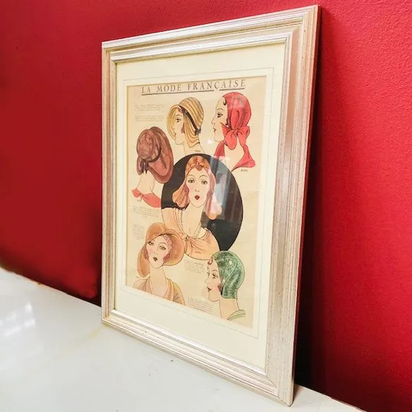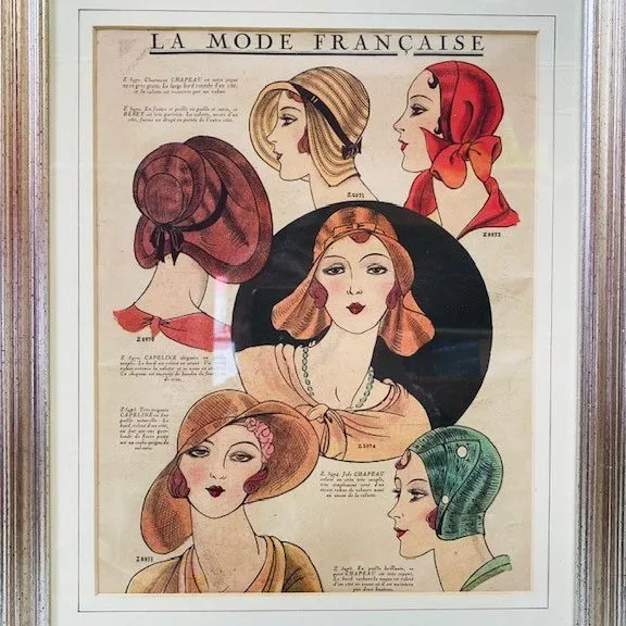 Prachtige ingelijste Artdeco modeprent met diverse leuke hoeden. Het betreft een bladzijde het tijdschrift La Mode Francaise uit de jaren 20 en is helemaal in de stijl van de flapper girls van die tijd.