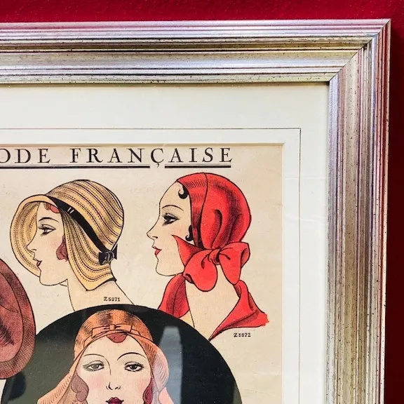 Prachtige ingelijste Artdeco modeprent met diverse leuke hoeden. Het betreft een bladzijde het tijdschrift La Mode Francaise uit de jaren 20 en is helemaal in de stijl van de flapper girls van die tijd