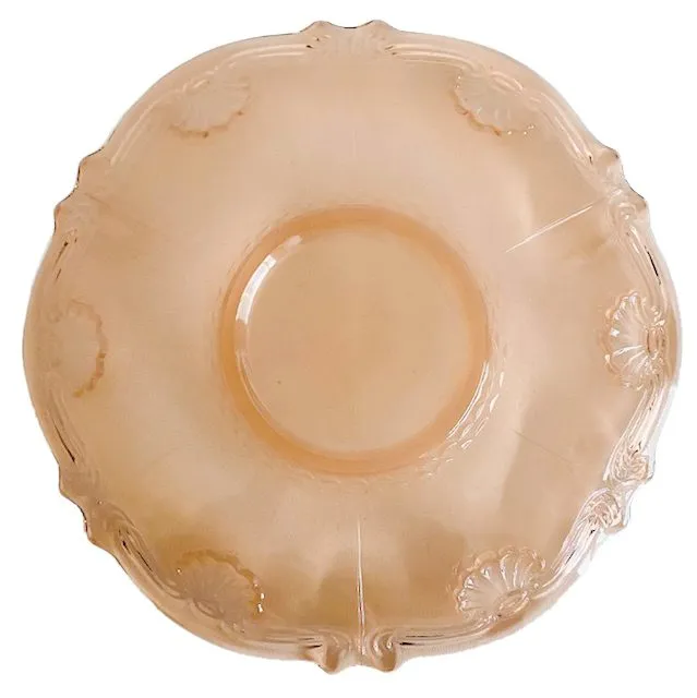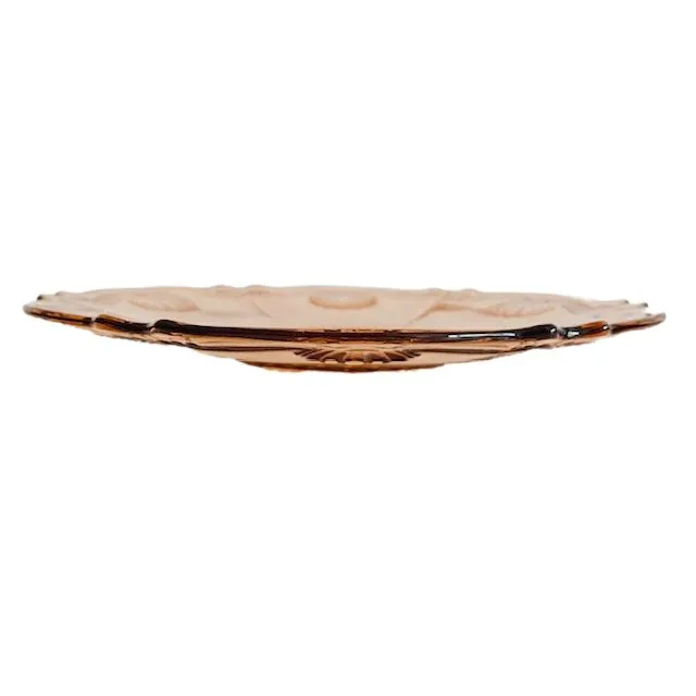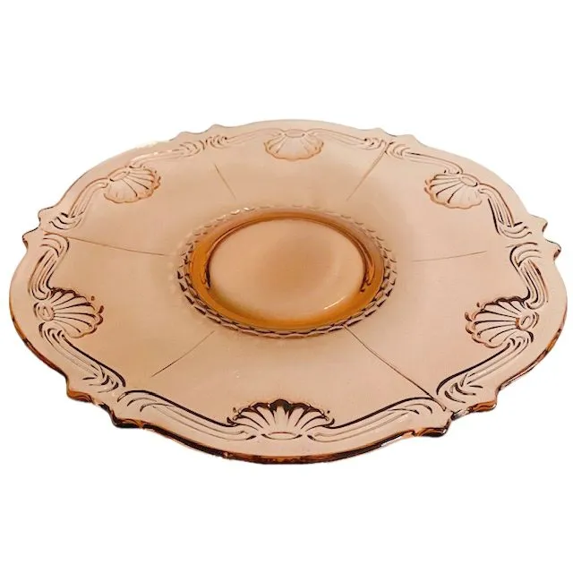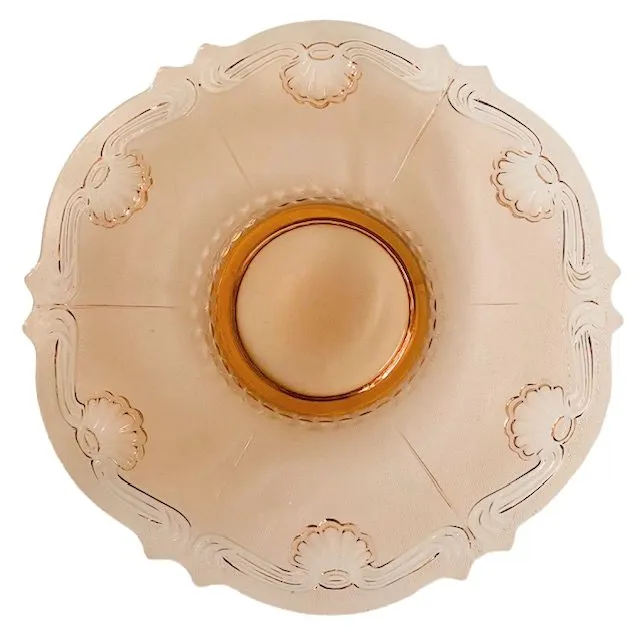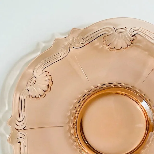 Art deco schaal van roze glas met een klassiek patroon uit de jaren 30. Deze artdeco schaal kan men als onderschotel gebruiken of als presenteerschaal voor desserts of rauwe groenten. Geproduceerd door Inwald in de lijn Barock, vermoedelijk rond 1935.