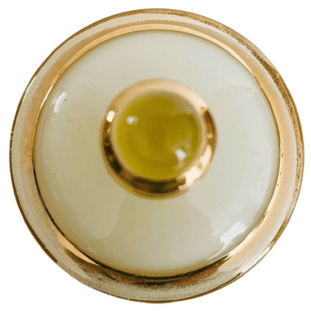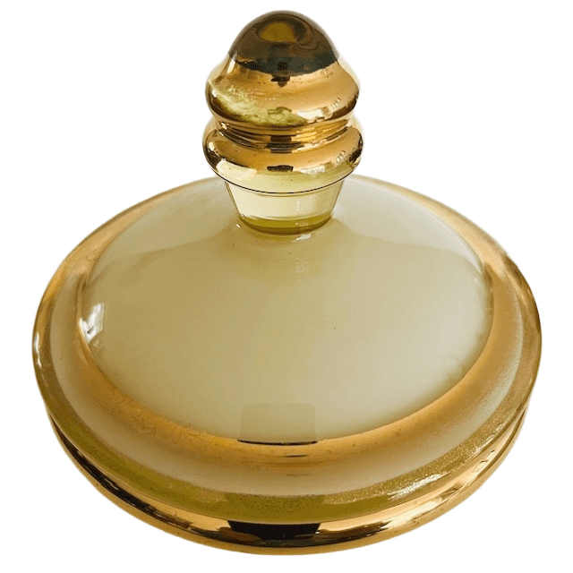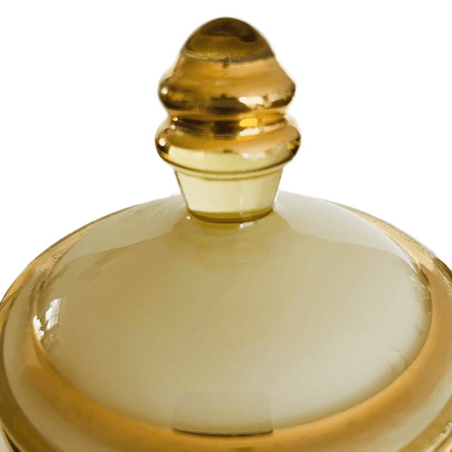 Prachtige Art deco stijl sieradendoosje in glanzend dun lichtgeel glas met gouden decoratie uit de jaren 50. Deze glazen poederdoos is vermoedelijk gemaakt door De Rupel in de jaren 50.
