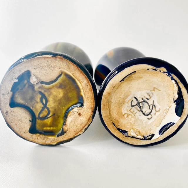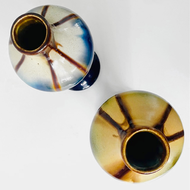 De vintage vaasjes zijn aan de onderzijde gemerkt en voorzien van de signatuur van de maker. De vazen zijn in goede vintage staat en 20 cm hoog met een doorsnede van 8 cm.