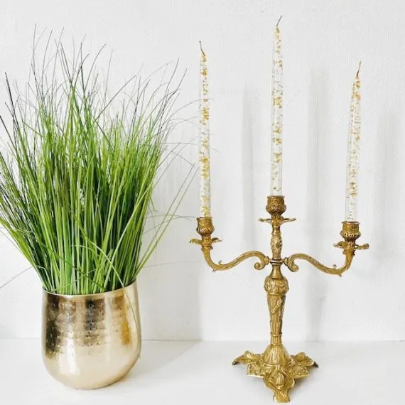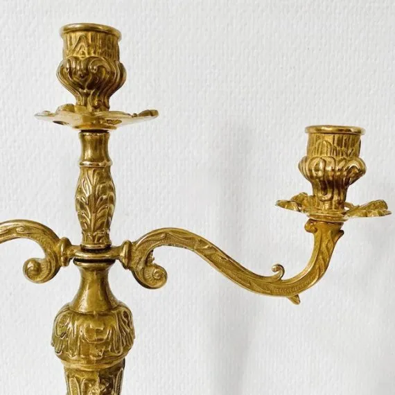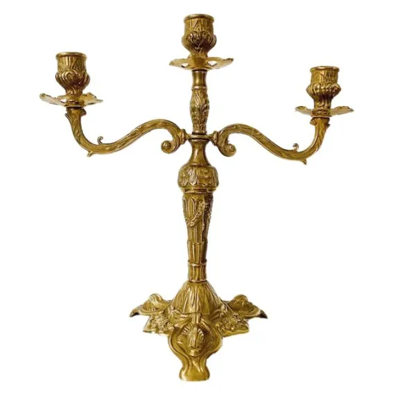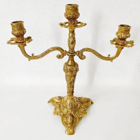 Prachtige barok messing kandelaar met Drie armen in Art Nouveau stijl. Deze driearmige Italiaanse kandelaar is opgepoetst en straalt daardoor weer als tevoren.. Deze gouden kandelaar is rond de jaren dertig van brons gemaakt.