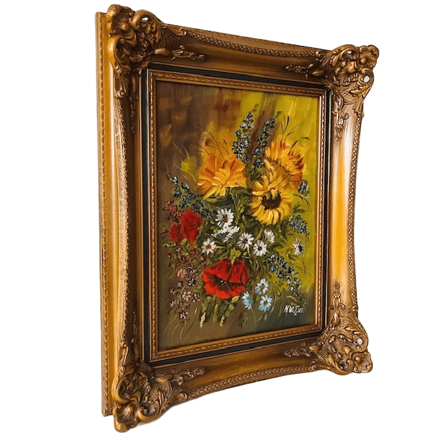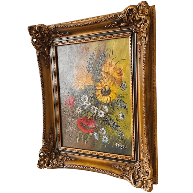 Prachtig barok olieverf bloemen schilderij met een groot bloemen boeket, geschilderd door N. Witjes in de jaren 60. Het vintage bloemenschilderij heeft een mooie barok lijst met veel ornamenten