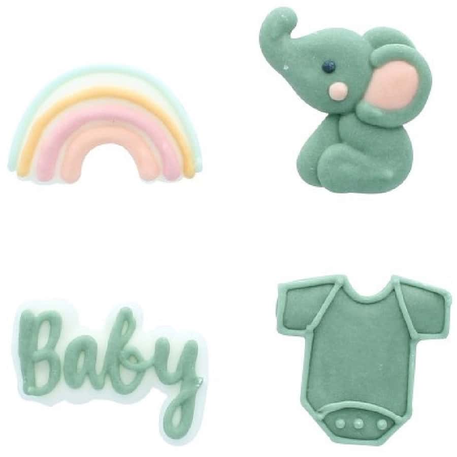 De figuurtjes zijn een olifantje, een regenboog, een rompertje en te tekst “baby” en dat alles in een mooie salie groene kleur. Superschattig om te combineren met andere tijdloze kleuren!