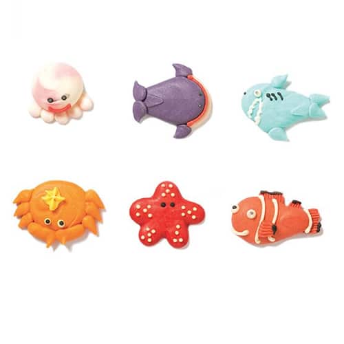 Decoreer je taart eenvoudig met deze handgemaakte suikerdecoraties in het thema zeedieren! De suikerfiguurtjes bevatten natuurlijke kleurstoffen. Perfect voor op je taart, maar ook voor je cupcakes en andere traktaties.