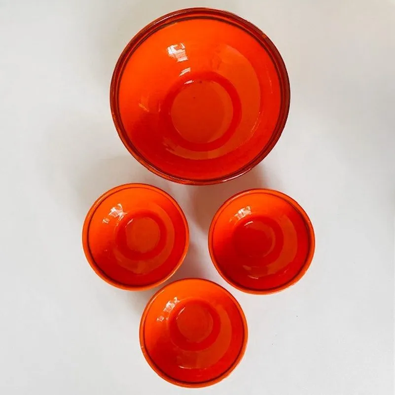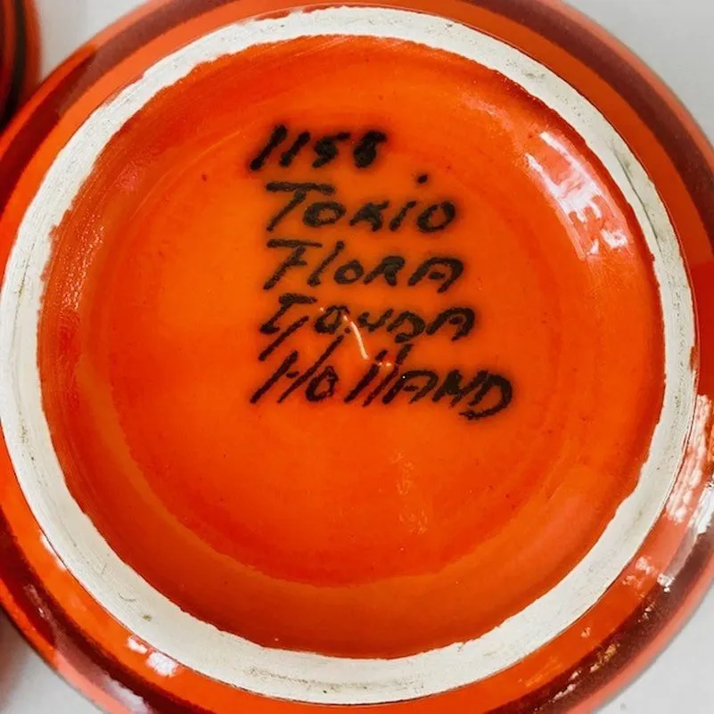 Leuke Gouds plateel Flora Holland schaaltjes set met decor Tokio uit de jaren 60. Plateelbakkerij Flora was van 1945 tot 1997 actief in Gouda. De schaaltjes zijn in uitstekende vintage staat. De grootse schaal is aan de onderzijde gemerkt (zie foto’s).