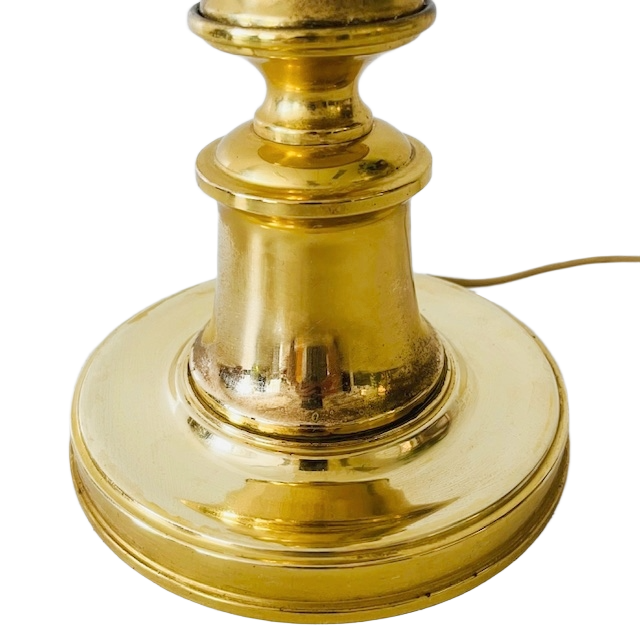Prachtige Hollywood Regency vintage messing tafellamp met een XL lampenkap in grijs. De tafellamp is in totaal 55 cm hoog. De messing lampenvoet is 43 cm hoog en heeft een doorsnede van 18 cm. De grijze lampenkap heeft een doorsnede van 40 cm en is 22,2 cm hoog.