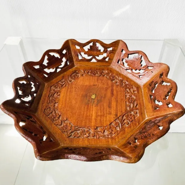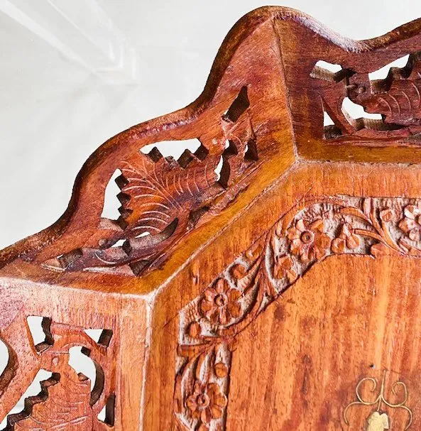 Leuk houtsnijwerk dienblad uit Indonesië met zes hoeken. Leuk om als kaarsenstandaard te gebruiken, maar ook aan de muur is ie prachtig. Het vintage houten dienblad heeft een doorsnede van 31 cm en is 6 cm hoog.