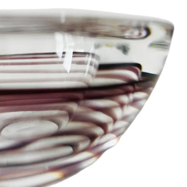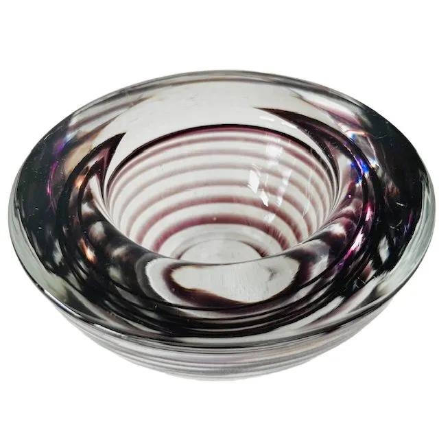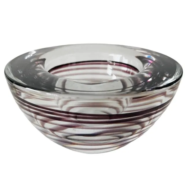 Prachtige handgemaakte Kosta Boda Votive waxinelichthouder uit de ‘Atoll’-serie met paarse swirl in helder glas. Deze vintage glazen theelichthouder is gemaakt in Zweden en ontworpen door Anna Ehrner rond 1990. Deze design waxinelichthouder is in zeer goede vintage staat.