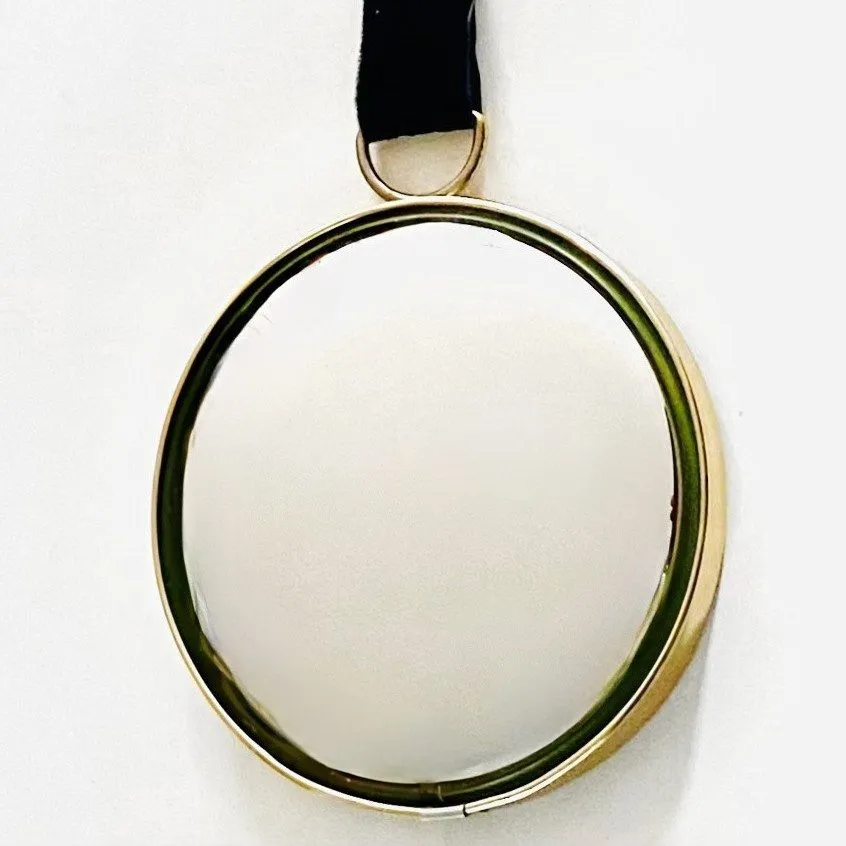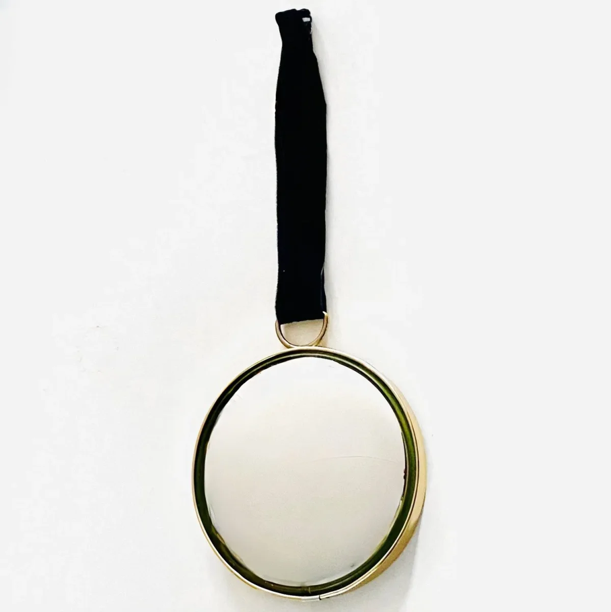 De heksenoog spiegel hangt aan een fluwelen koord met ophangoog. De fish eye spiegel heeft een doorsnede van 20 cm en 4 cm diep. Inclusief ophanglint is hij circa 60 cm hoog.