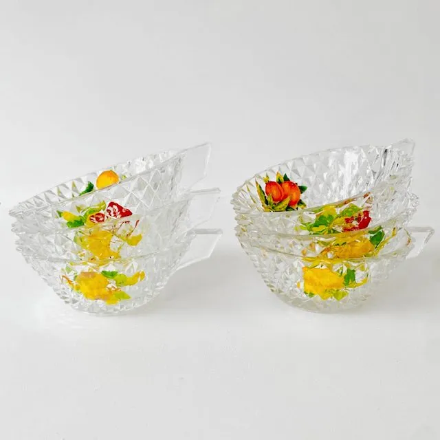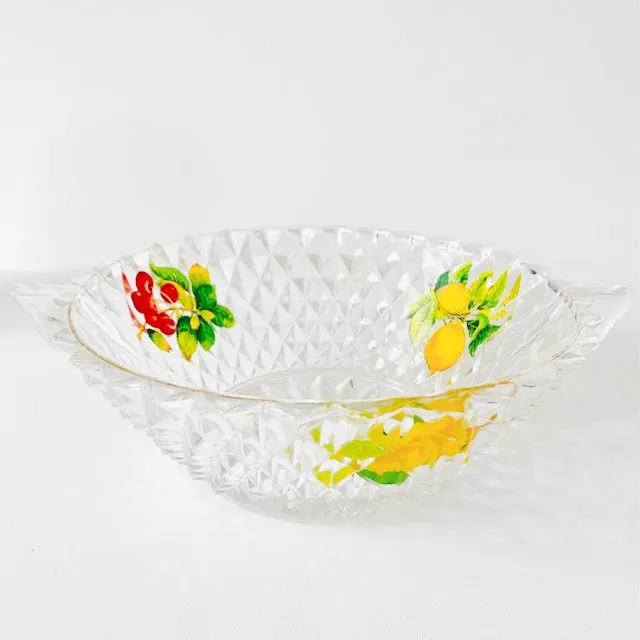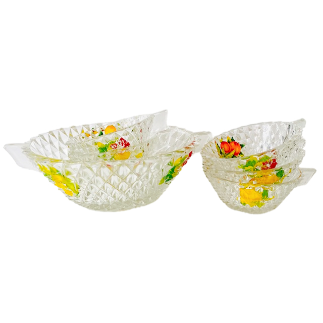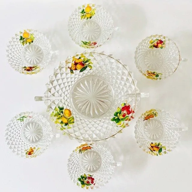 De grote schaal en coupes zijn gemaakt van persglas en aan de buitenzijde gedecoreerd met diamond point patroon, de binnenzijde is emaille beschilderd met bloemen, op de bovenzijde een gouden rand. Deze set is helemaal leuk voor het serveren van sangria of punch.