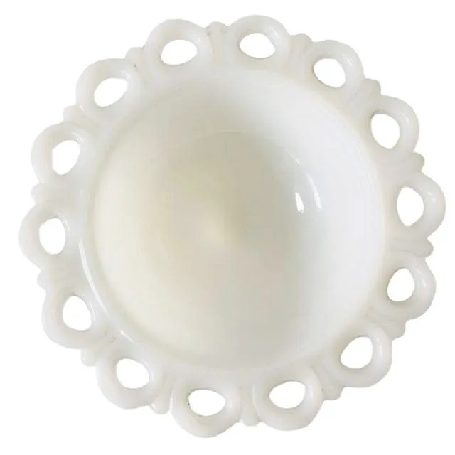 De bonbonschaal op voet is gemaakt van Anchor Hocking wit Melkglas en heeft een opengewerkte geschulpte rand. Deze opaline bonbonnière is 9 cm hoog en heeft een doorsnede van 18 cm.