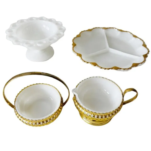 Mooie combinatie van divers mid-century opaline koffieservies uit de jaren 60. De set bestaat uit twee bonbonschalen en een roomstel.