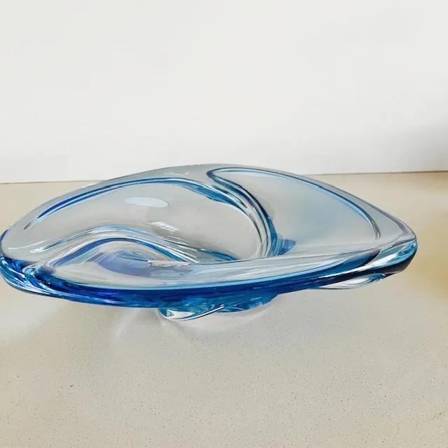 Mid-century XL Val Saint Lambert model Patelle serie Torsade schaal in blauw en helder glas, ontworpen door René Delvenne in de jaren 50.
