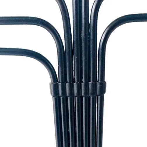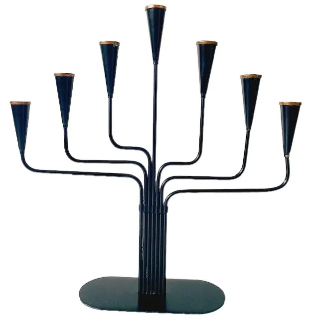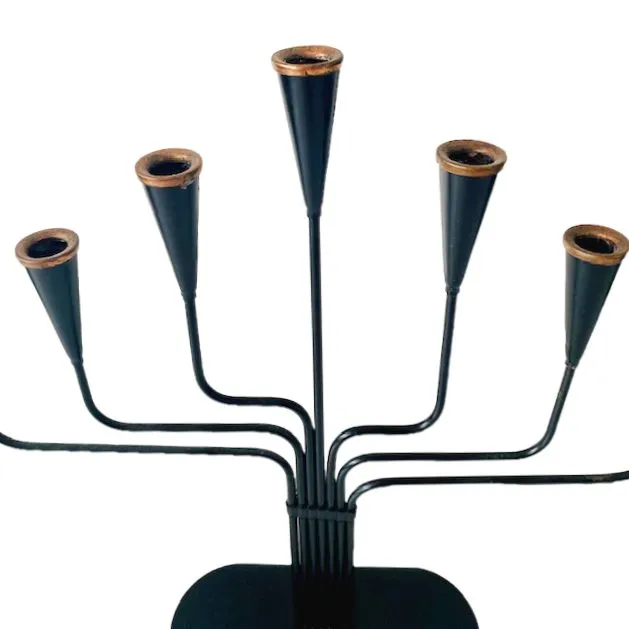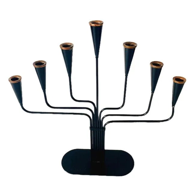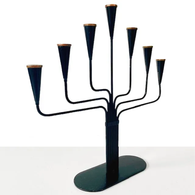 Deze mid-century zwarte zevenarmige kandelaar is gemaakt van gelakt metaal met een messing bies om ieder verlichtingspunt.