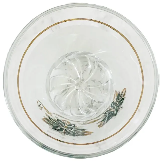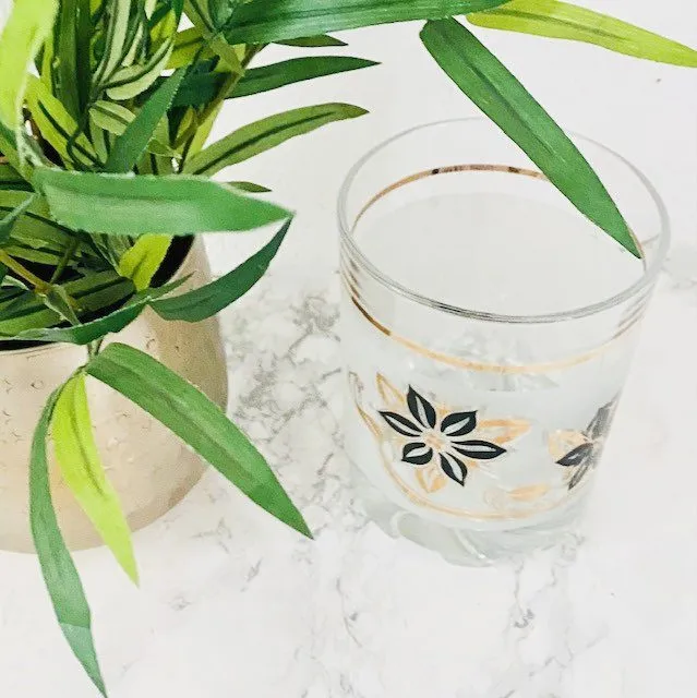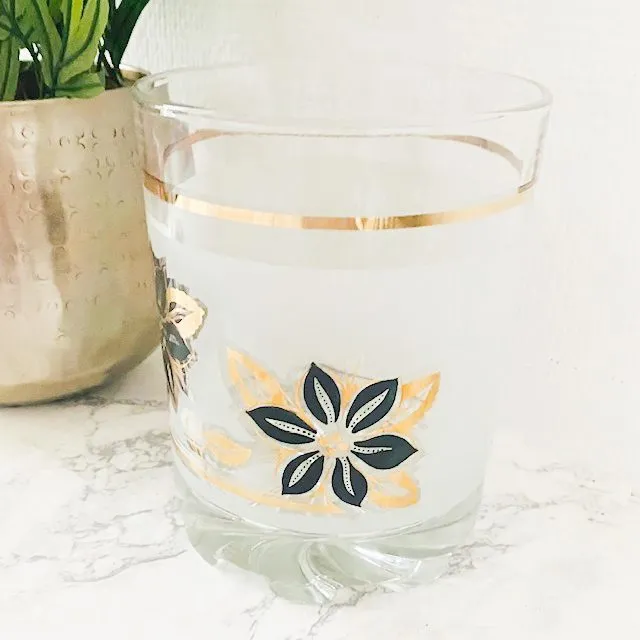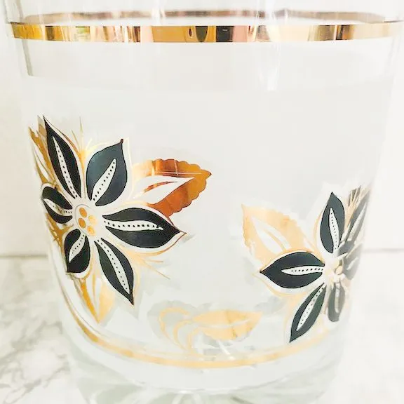 Deze midcentury ijsemmer van glas is gemaakt in Italië door DeValBor. Het ijsglas verkeert in uitstekende staat en is voorzien van wit matglas met een zwart-goud decoratief bloemenontwerp aan de ene kant. De bodem heeft een wervelend patroon met de woorden “DeValBor” en “Italië” erin gedrukt. Een gouden band omcirkelt de emmer net onder de rand. Het dikke glas aan de basis zorgt voor extra stabiliteit en isolatie aan de bak. De glazen ijsemmer in in uitstekende vintage staat en 14 cm hoog en 11 cm in diameter.