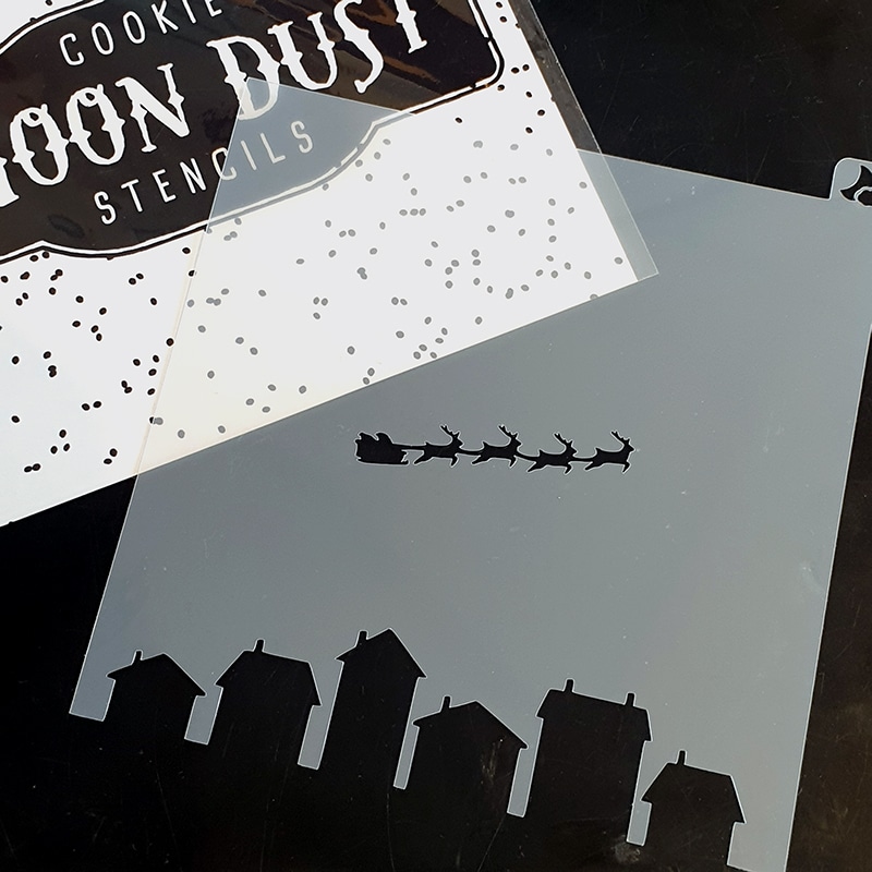 Maak met behulp van dit stencil van MoonDustStencils, met de slee van de Kerstman vliegend boven de huizen prachtige koekjes! Gebruik Royal icing, poeder of de airbrush om een superleuk effect op koekjes of andere traktaties met een glad oppervlak (icing, glazuur, fondant)