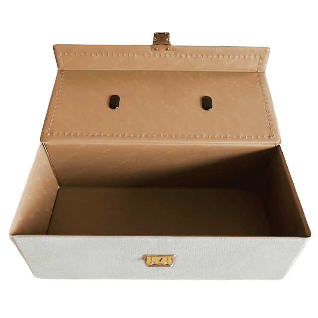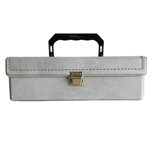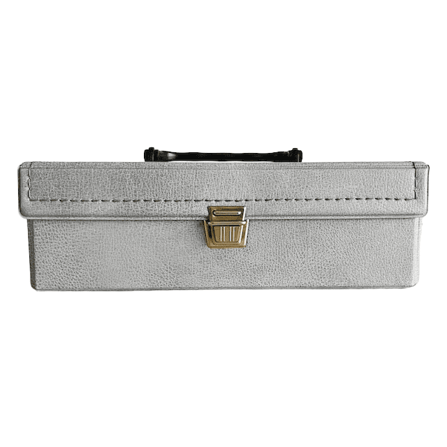 Het cassettekoffertje is in goede vintage staat en 26,5 cm lang, 14,5 cm breed en 8,5 cm diep.