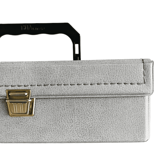 Funky retro vintage cassettekoffer in grijs zwart uit de jaren 70.