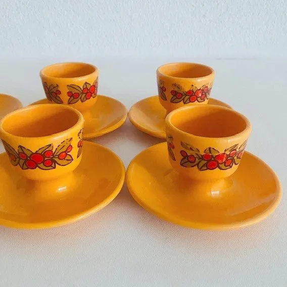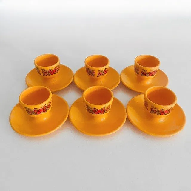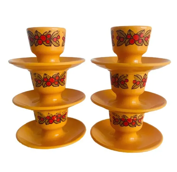 Set van zes retro okergele kunststof eierdopjes van D.B.P. uit de jaren 70.