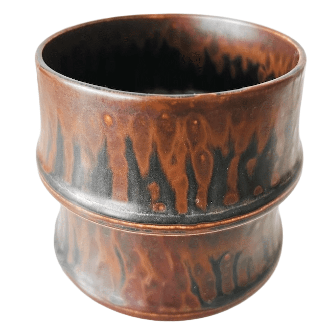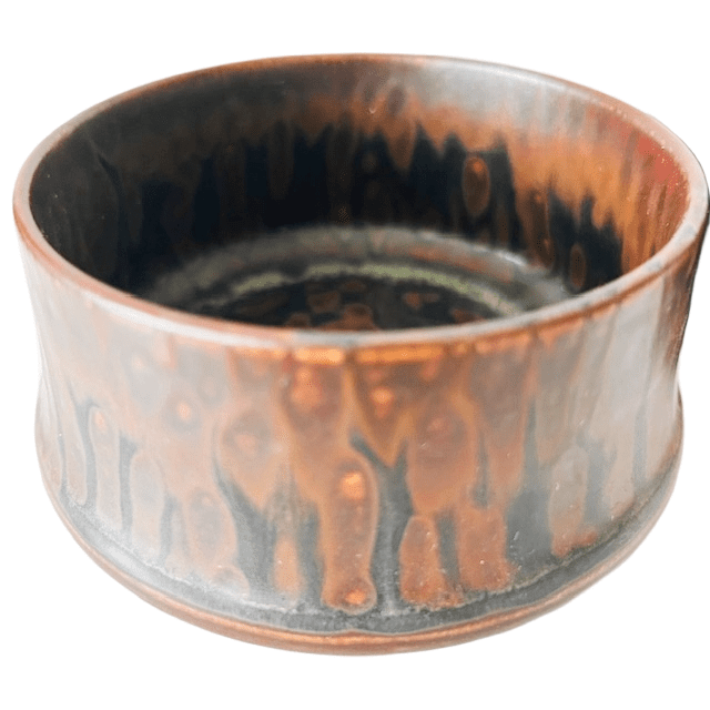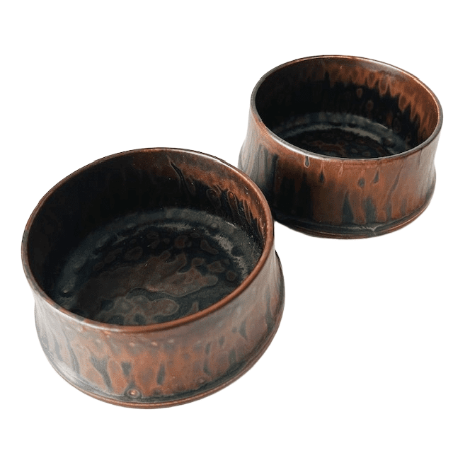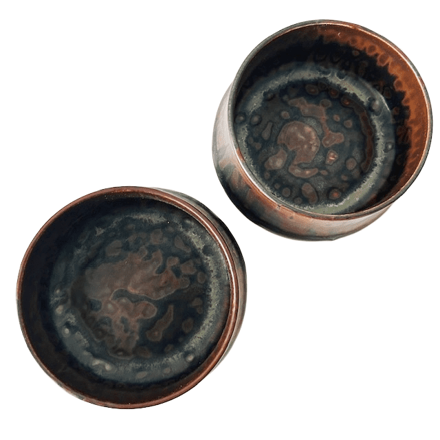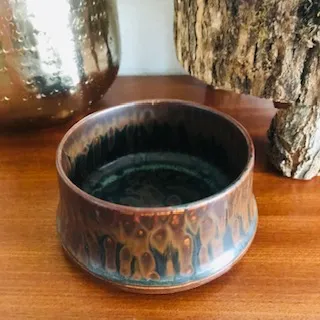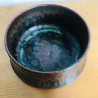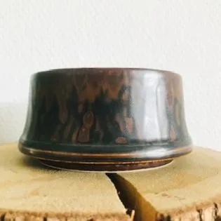 De schaaltje hebben in de basis een bruine kleur, maar door het aparte glazuurwerk ook nog blauw en paarstinten. Leuk om hapjes in te serveren. De schaaltjes zijn 5 cm hoog en hebben een doorsnede van 11,5 cm.
