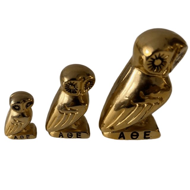 Set van drie vintage metalen Griekse uiltjes van Athena die 24k karaat goud verguld zijn uit de jaren 60.