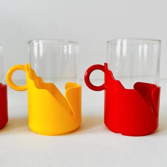 Set van vier vintage theeglazen met kunststof houder in primaire kleuren en bijpassend dienbladje uit de jaren 80.
