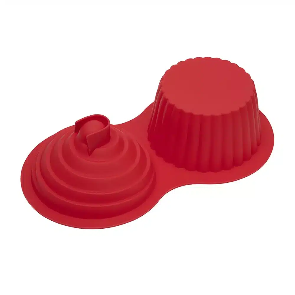 De bakvorm is gemaakt van flexibel silcone met een temperatuurbereik van – 60 tot + 300 °C. De totale maat is 38,5 x 20,5 x 10cm. De “toef” heeft een doorsnede van ø17cm en de onderzijde van de cupcake is ø13cm.
