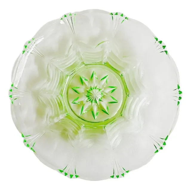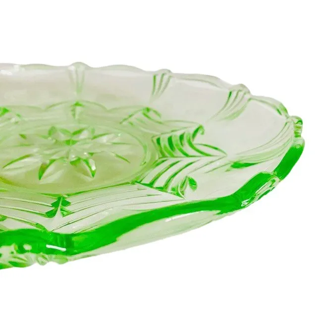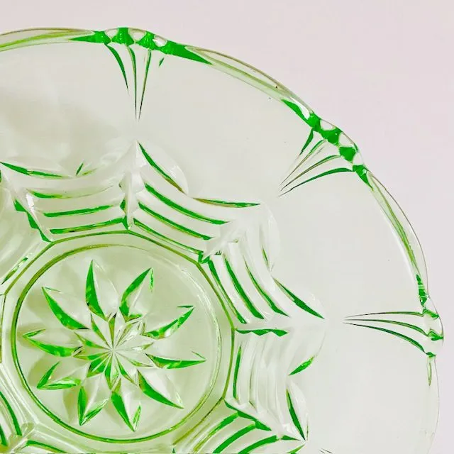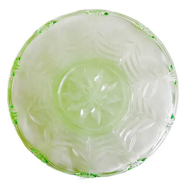 Prachtige uraniumglas annagroen neon glazen schaal met licht geschulpte rand met in het centrum een ster. Deze schotel is geproduceerd rond 1935, vermoedelijk door Leerdam glas in Nederland.