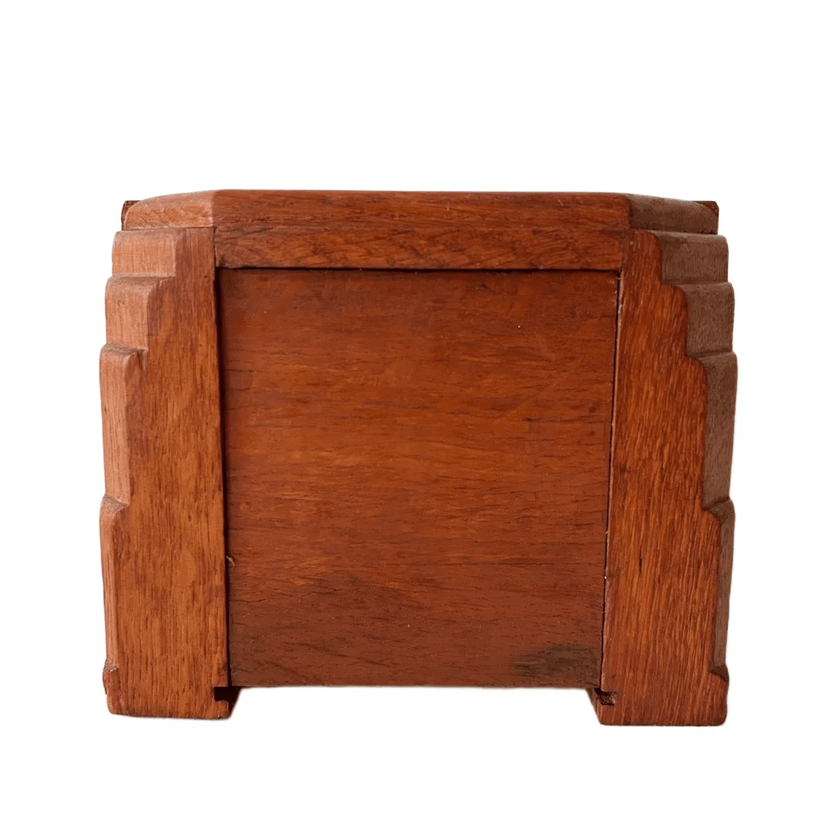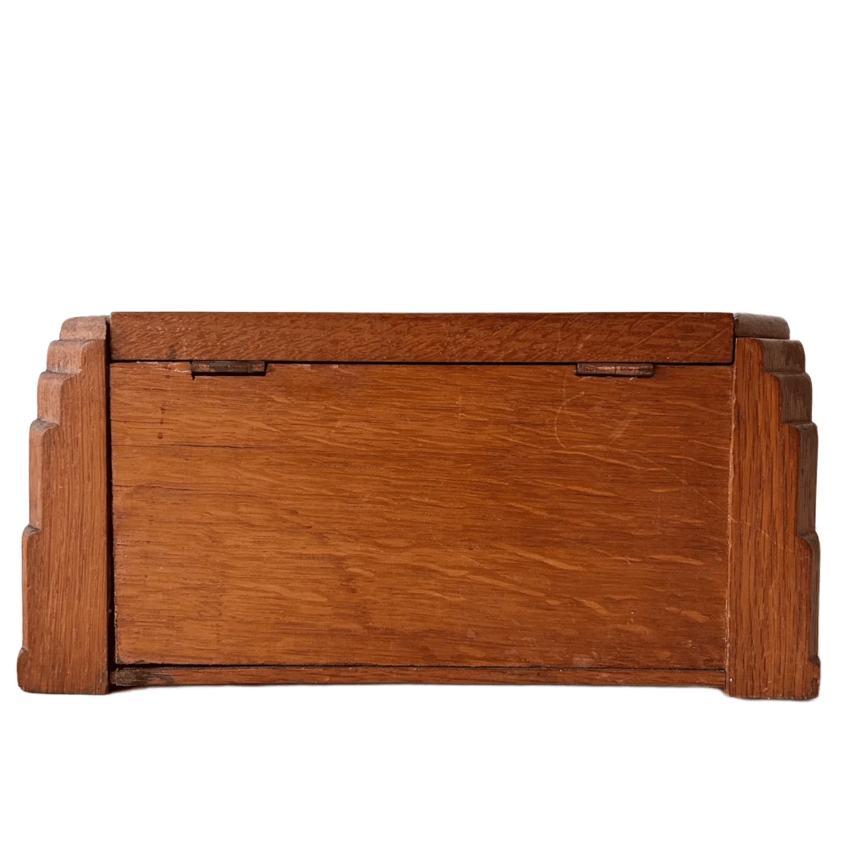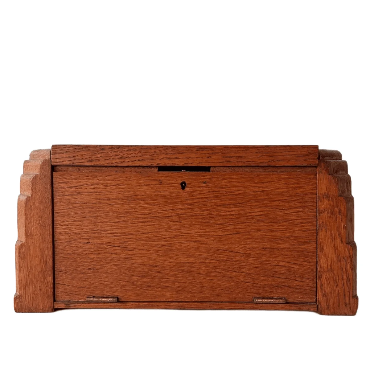 Prachtige vintage Amsterdamse school Art Deco sigarendoos uit de jaren 30 gemaakt van massief eikenhout. De antieke sigarenkist is in goede vintage staat en 29 cm breed, 17 cm diep en 14 cm hoog.
