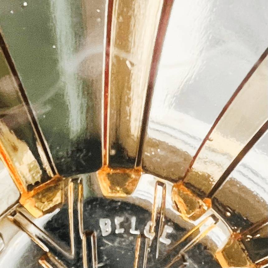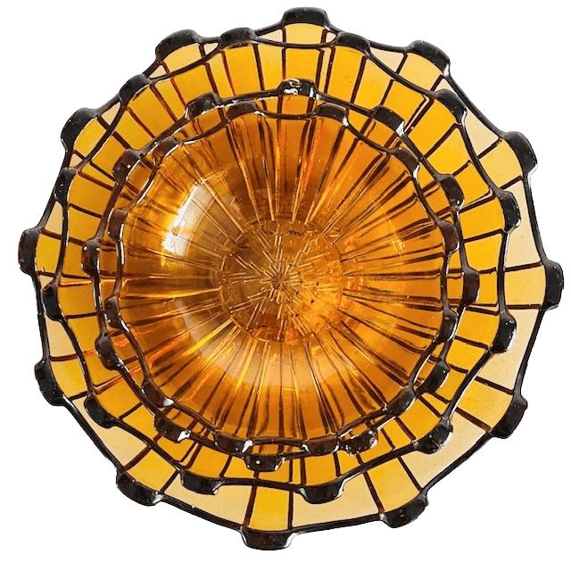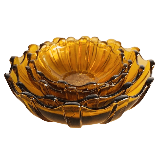 Vintage Art Deco glazen set bestaande uit vier schalen gemaakt van amber persglas uit de jaren 30. De schalen zijn aan de onderzijde gemerkt met “belge” en vermoedelijk geproduceerd door het Belgische Scailmont.