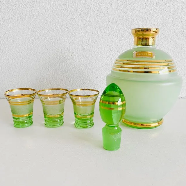 Zeldzame vintage artdeco likeur decanter karaf in groen glas met stop. De likeur decanter is gemaakt met goud en zilver gedecoreerd groen Booms glas.