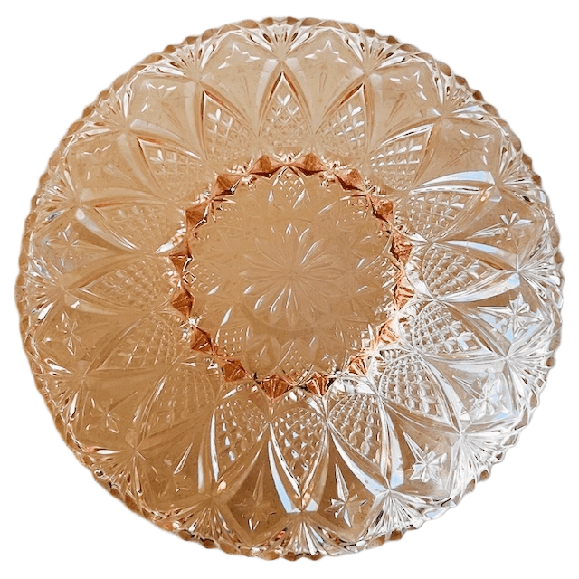 Vintage Art deco fruitschaal van roze kristal met prachtige gravures uit de jaren 30. Deze artdeco schaal is in uitstekende vintage conditie.