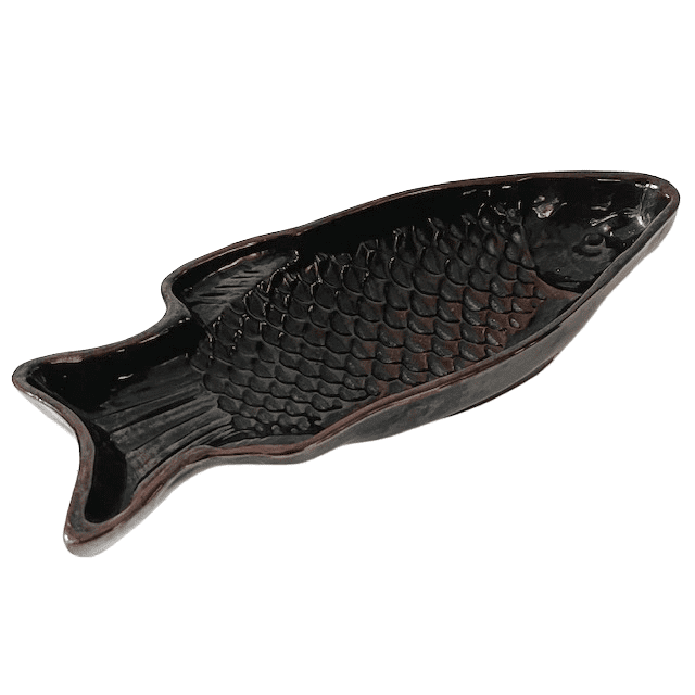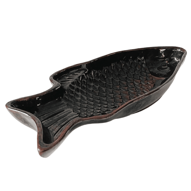 De keramieken vis is in goede vintage staat en 35 cm lang, 14 cm breed en 5,5 cm hoog.