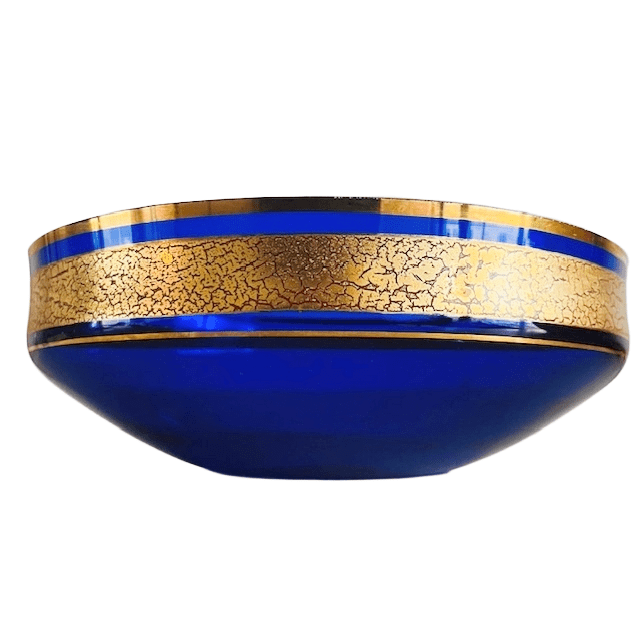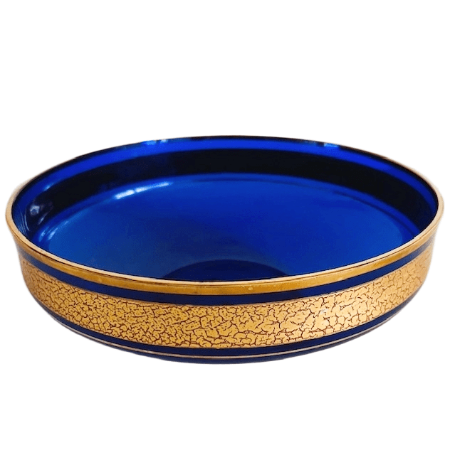 Prachtig, deze vintage Vintage Barthman kobalt blauw schaal kristal met gouden decoratie ring uit de jaren 40. De schaal is in goede vintage staat, heeft wat lichte schuifsporen aan de onderzijde. De schaal is aan de onderzijde gemerkt (zie foto).